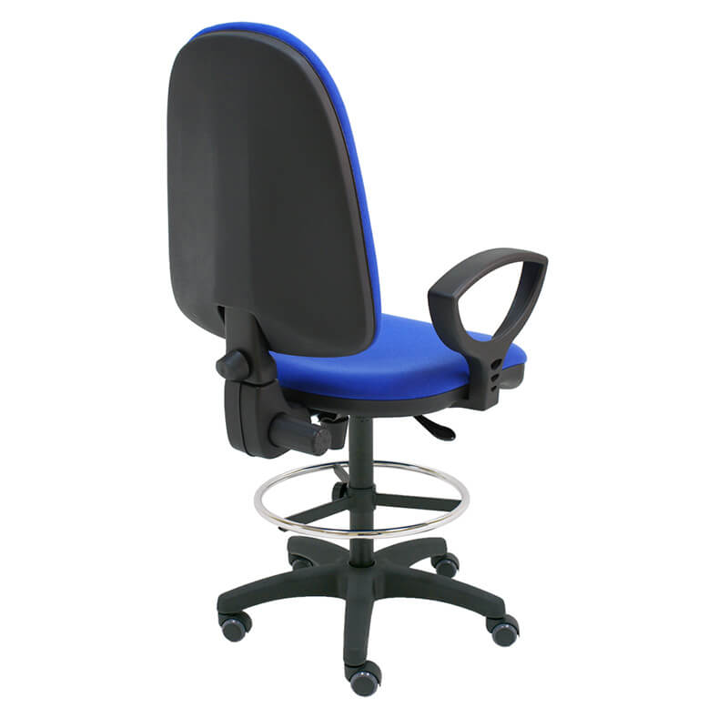 Taburete giratorio tapizado con sistema de elevación a gas. Reposapies regulable cromado. Respaldo regulable en profundidad, altura e inclinación.
